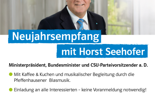 Pfeffenhausen. Am Sonntag, 18. Januar, lädt die CSU-Ortsgruppe um 14 Uhr zum diesjährigen Neujahrsempfang in das Pfarrheim am Gaisberg ein. Als Festredner kommt mit Horst Seehofer ein wahrer Hochkaräter nach Pfeffenhausen.