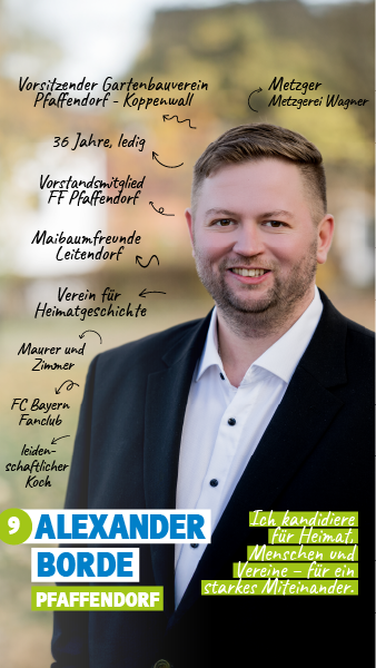 Alexander Borde aus Pfaffendorf ist gelernter Metzger und überzeugter Handwerker. Er arbeitet in Pfeffenhausen in der ortsansässigen Metzgerei Wagner. Er setzt sich für eine Gemeinde ein, in der Zusammenhalt über die Generationen hinweg großgeschrieben wird, egal ob in den Dörfern oder in Pfeffenhausen. Als Vorsitzender des Gartenbauvereins Pfaffendorf - Koppenwall zeigt er Gesicht und lebt seine Überzeugungen authentisch.
