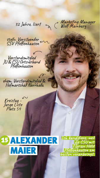 Alexander Maier, beruflich Marketing Manager beim Mainburger Heizungs- und Klimagerätebauer Wolf, ist in Pfeffenhausen als Mensch fest verwurzelt. Beispielsweise übernimmt er beim SSV Pfeffenhausen als stellv. Vorsitzender Verantwortung, viele Jahre war er als Hofmarschall auch die "Stimme" des Pfeffenhausener Faschings. Weil er zu 100 % hinter dem vor sechs Jahren eingeschlagenen Kurs steht, will er mit seiner Kandidatur unser Team und Florian Hölzl unterstützen.