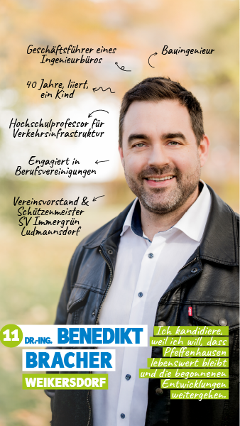 Dr.-Ing. Benedikt Bracher bringt als Professor für Verkehrsinfrastruktur viel Fachwissen für den kommunalpolitischen Alltag mit. Als Schützenmeister der Immergrün Schützen Ludmannsdorf sind dem Vater eines Sohns Heimat und Tradition wichtig. Sein Wissen, seine Erfahrungen und seine Überzeugungen will er nun in den Marktgemeinderat einbringen.