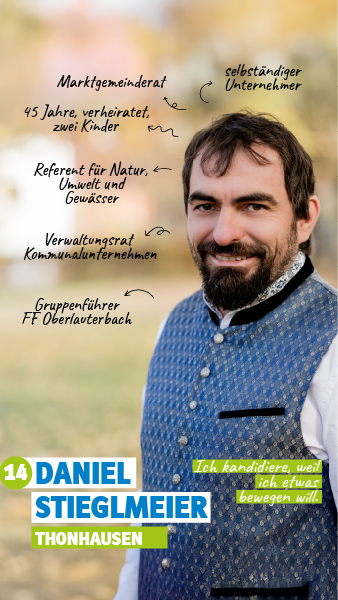 Daniel Stieglmeier aus Thonhausen ist selbständiger Unternehmer und hat den Familienbetrieb kontinuierlich um weitere Geschäftsfelder erweitert. In Sachen Abwasserbeseitigung ist er ein geschätzter und verlässlicher Ansprechpartner vieler Kommunen. Er hat nicht nur seine Familie und sein Unternehmen im Blick - auch eine funktionierende Dorfgemeinschaft ist ihm ein Herzensanliegen. Deshalb engagiert er sich ehrenamtlich, unter anderem als Marktgemeinderat.