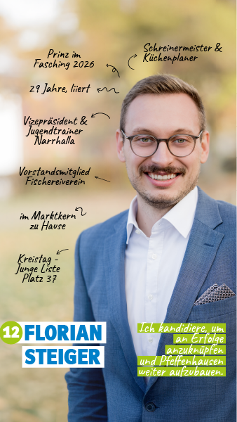 Florian Steiger, mit 29 Jahren unser jüngster Bewerber für den Marktgemeinderat, kann als Schreinermeister auf eine fundierte handwerkliche Ausbildung zurückgreifen. Er wohnt im Ortskern und bringt sich von Kindesbeinen an in unser Pfeffenhausen ein. Als Faschingsprinz ist er gemeinsam mit seiner Prinzessin Johanna dieser Tage der oberste Repräsentant der Gemeinde.