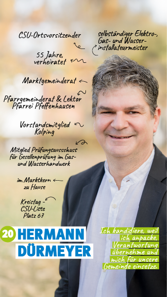 Hermann Dürmeyer ist selbstständiger Elektro-, Gas- und Wasserinstallateurmeister und führt das traditionsreiche Elektrogeschäft in der Pfeffenhausener Marktmitte. Als Marktgemeinderat und CSU-Ortsvorsitzender ist er einer der "Eckpfeiler" unseres Teams. Sich zu engagieren, ist ihm in die Wiege gelegt worden. Sein Vater war über viele Jahre hinweg Marktgemeinderat, 2. Bürgermeiser und Kreisrat.
