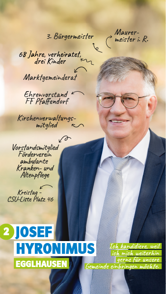 Seit vielen Jahren bringt sich Josef Hyronimus aus Egglhausen gewissenhaft und mit Verantwortungsbewusstsein ein. Er ist vielfältig engagiert und als 3. Bürgermeister ein erfahrener Kommunalpolitiker mit Format. Er ist ehrlich, geradlinig und ein "Eckpfeiler" unserer Mannschaft.