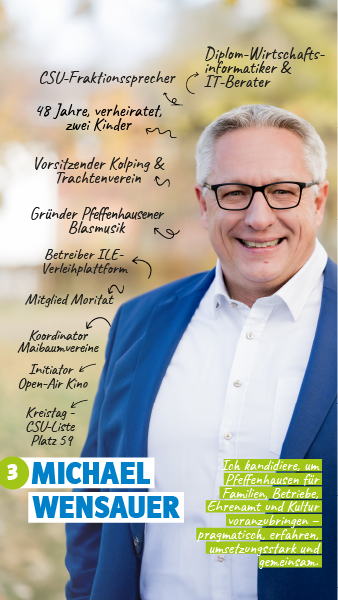 Michael Wensauer ist Diplom-Wirtschaftsinformatiker und unterstützt Firmen im In- und Ausland bei der digitalen Transformation. Er ist Fraktionssprecher der CSU und damit einer der "Architekten" der Entwicklung der letzten Jahre. Reich ist sein ehrenamtliches Wirken: Zum Beispiel fungiert er als Vorstand der Kolpingsfamilie und des Trachtenvereins. Ein besonderes Anliegen ist ihm die Vernetzung von Menschen und Organisationen.