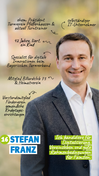 Stefan Franz ist selbstständiger IT-Unternehmer. Er hat beruflich den Schritt aus einem Weltkonzern in die Selbständigkeit gewagt. Als Dienstleister unterstützt er Firmen & Organisationen dabei, sichtbar zu werden. Engagiert ist er u. a. als Digitalexperte beim Bayerischen Turnverband, als CSU-Digitalbeauftragter und als Turntrainer beim TV Pfeffenhausen. Sport & Bewegung und die bodenständige Gestaltung des digitalen Wandels sind seine Steckenpferde.